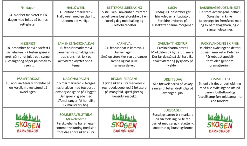 Skogen barnehage har egen avdeling (Haukene) med førskolegruppe som har eget pedagogisk opplegg gjennom hele året. Målet med gruppen er at barna skal få de beste forutsetninger for å mestre overgang til skolen. Dette gjør vi ved: